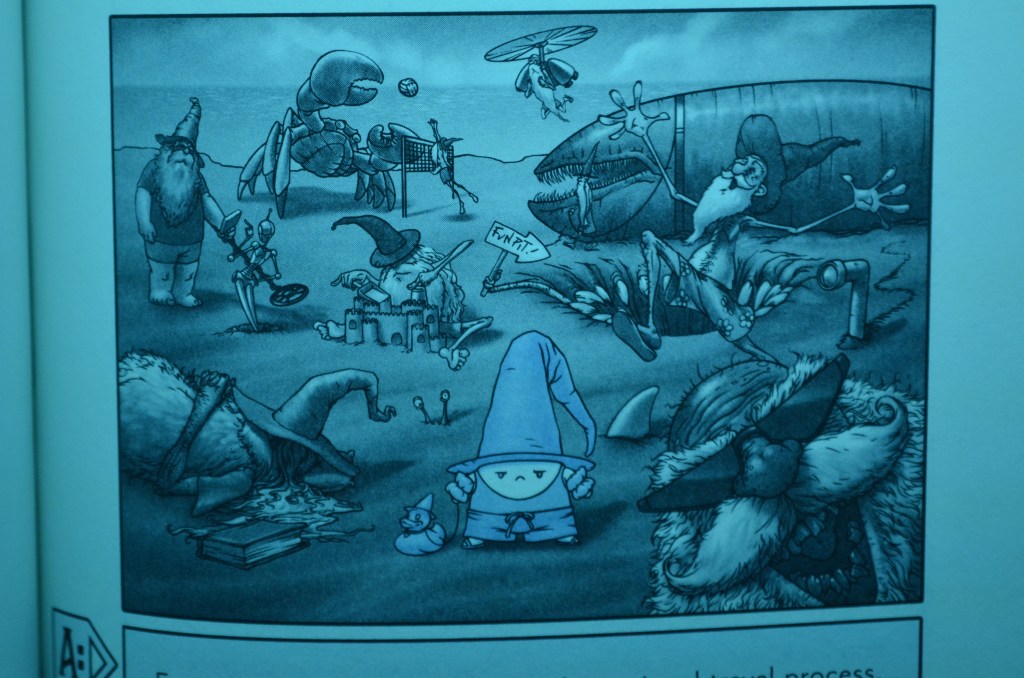 Simply placing a book in a ‘potential zany setting’ isn’t enough. In this regard, the art actually works against the book. The story is interrupted at times by insanely cool artistic spreads that explain how the worldbuilding works as well as the concept of traveling to other dimensions (turns out we’re not in our medieval England after all). The problem is, all the other dimensions that can’t happen because of in-universe reasons sound way cooler and more interesting than the one in which we’re currently trapped. Out of all the possibilities, we landed in a dimension which contains: one bland protagonist man, some possibly interesting sprite/rune-based magic, and a very cool and badass woman who is unfortunately dragged down by the plot’s need to have her fall in love with bland protagonist man.