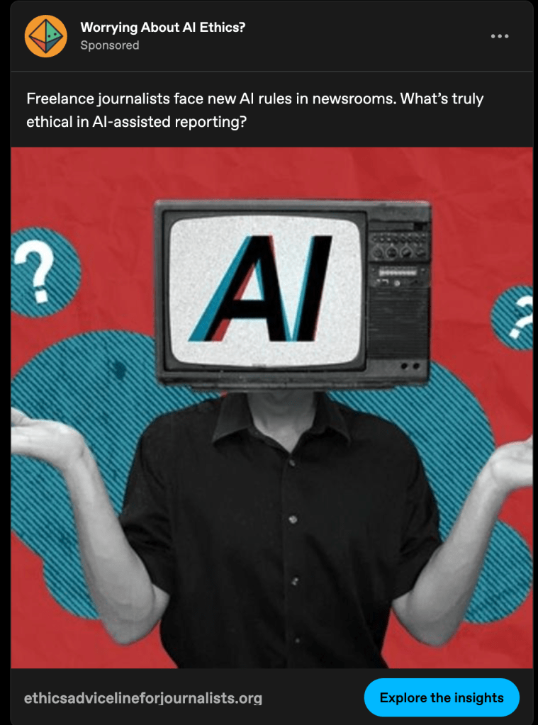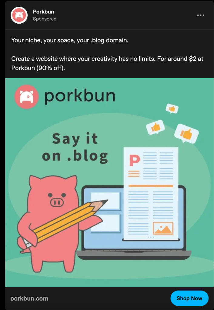 Of the few select social media sites I occasionally spend time on, several have gotten weird lately when it comes to advertisements. I’ve gotten used to ads that have been hand-picked by the algorithm for my viewing, and those mostly breeze by the peripherals of my life without my brain registering them. I’ve gotten good at tuning out ads, simply out of necessity. There are SO MANY ALL OF THE TIME EVERYWHERE, (especially for AI, uuuuugh) that I mostly delete, skip, or suffer through them with minimal impact.