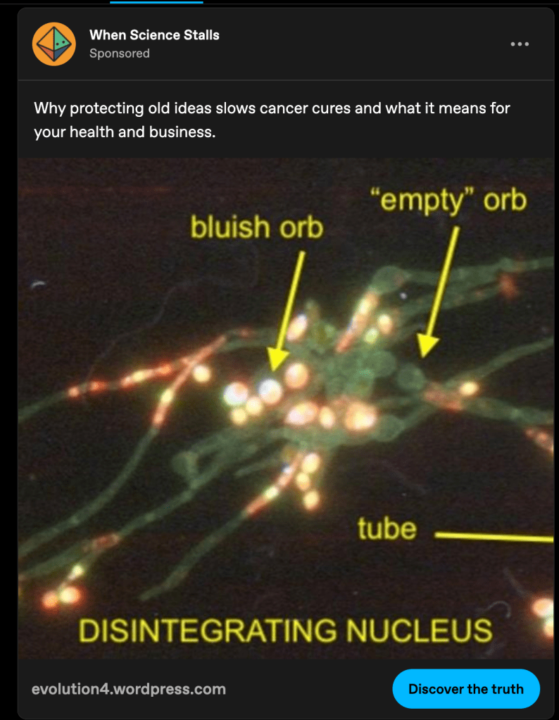 This ad has everything. A cut off image. Vague conspiracy-theory-sounding ideas. Ironic quotes around a “random” word. Word salad to the point where you have little to no idea what it’s actually trying to sell you. The words DISINTEGRATING NUCLEUS in all caps. The button to find out more being labeled “discover the truth.” A link to a wordpress site. 10/10.