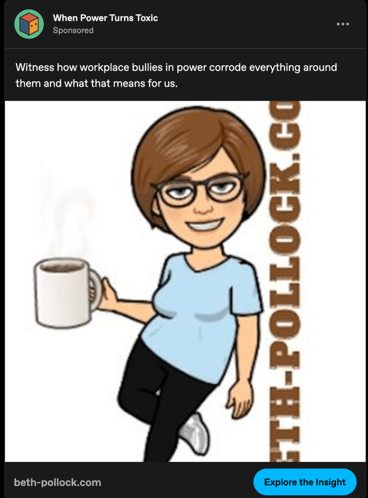 Another 10/10 advertisement. Who are these workplace bullies? Who is “us”? Who is Beth Pollock and why is she trying to advertise to me? Why is “Insight” capitalized? So many questions, so little time. In addition, we have the classic “image cut off” aspect which gets bonus points for cutting of the name of the website. I also love the bitmoji slapped on a white background with no other context. It looks like something my mom would text me.