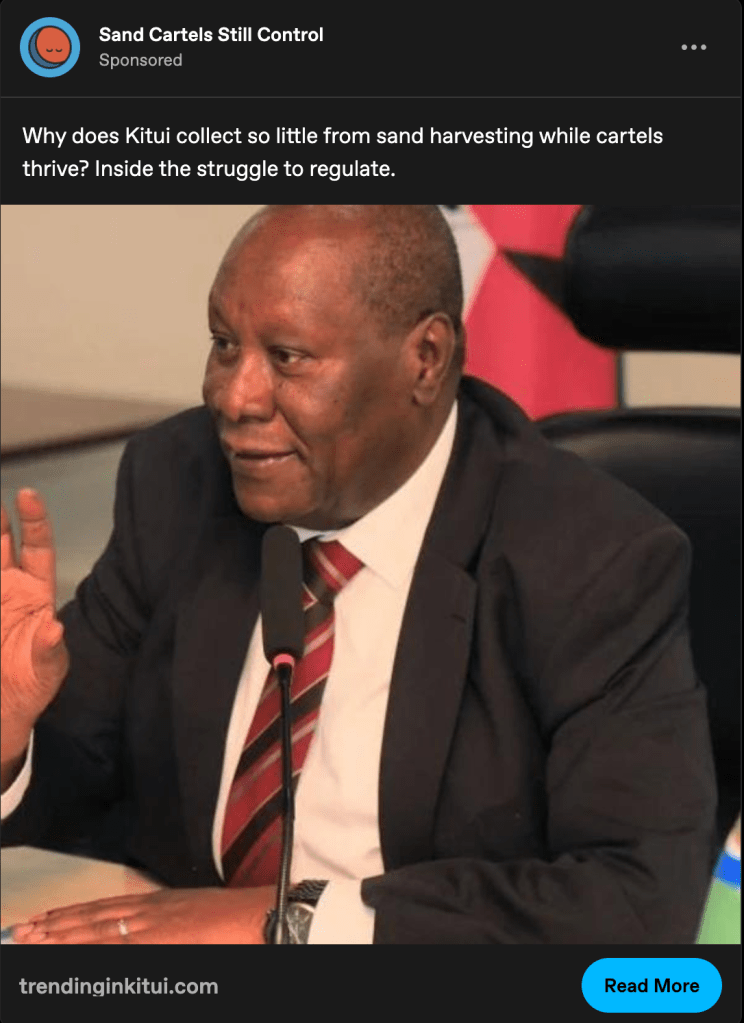 This ad sent me down a wiki rabbit hole on sand cartels, I thing I had never heard of before this ad. Apparently anything can be smuggled, including sand, mostly for construction purposes. Kitui is a county in Kenya, where rivers are being eroded by illegal sand harvesting to the point where it’s threatening local water supplies. Of all the strange ads I received during this venture, this one gets bonus points for at least teaching me something.