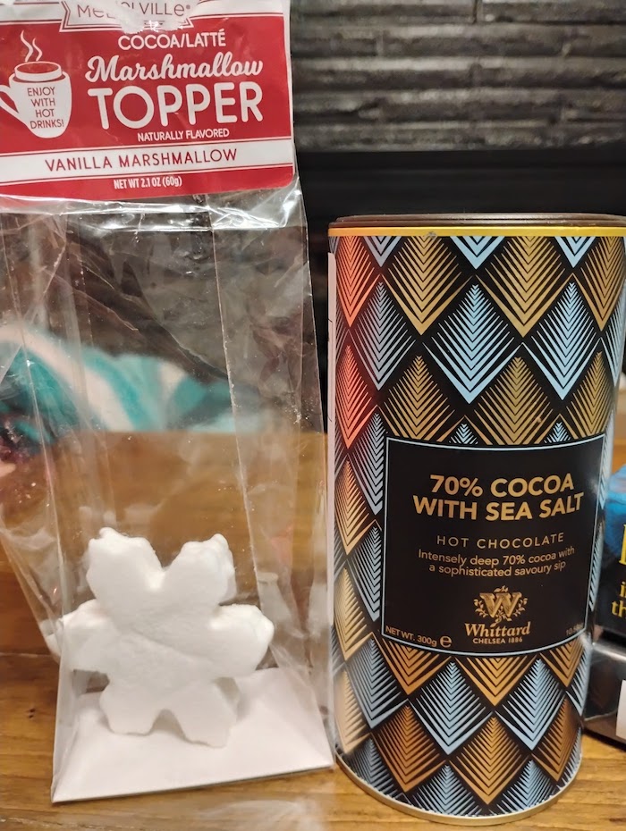 What I’m drinking: More gifts (which I’m trying to finish up lest they go stale) also from World Market. I’m a sucker for delicious hot chocolate as well as chocolate mixed with sea salt, so this was an easy choice. My area has also dipped to near freezing temperatures in the last week, so a cup of cozy chocolate sounded delicious. At 70% cocoa, the drink avoids the trap of over-sweetness, and a snowflake-shaped marshmallow compliments it perfectly. The only thing that would have made it more cozy would have been actual snow outside.